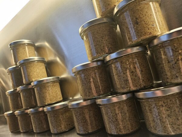 Unser Hausgemachter Senf: wer ab und zu mal zu Hause scharf isst wird diesen Senf lieben. Alle anderen werden Ihn lieben lernen. Die Resonanz an unseren Verkaufsständen war bis jetzt grossartig positiv. Deswegen möchten wir Euch diesen, in Bellach hergestellten Senf nicht vorenthalten. Aus im Stein gemahlenen Bio-Senfkörnern, gemischt mit diversen Kräutern und Essig, entsteht dieses würzig rassige 100g Senfglas. Andere Grössen auf Anfrage.